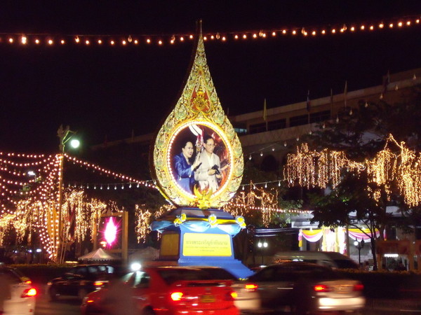 タイ バンコク 王室のなんかの記念日らしい?国王などの写真が全国あちらこちらに掲げられていた。夜王宮前の大通りでは歌や踊りなどの催し物が遅くまで。スクンビットはずれの宿へ帰るのに3時間かかった。 |