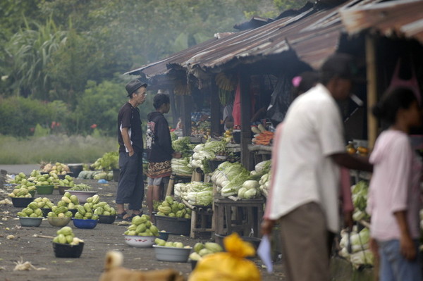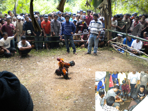 トラジャ 闘鶏 インドネシアはイスラム教なので博打はご法度のはず。山の中の隠れた場所でやっていた。ちょっとやばい雰囲気が・・・男たちが札びらを握り締めて胴元に群がる。その前に自分の賭ける鶏を品定め。 |