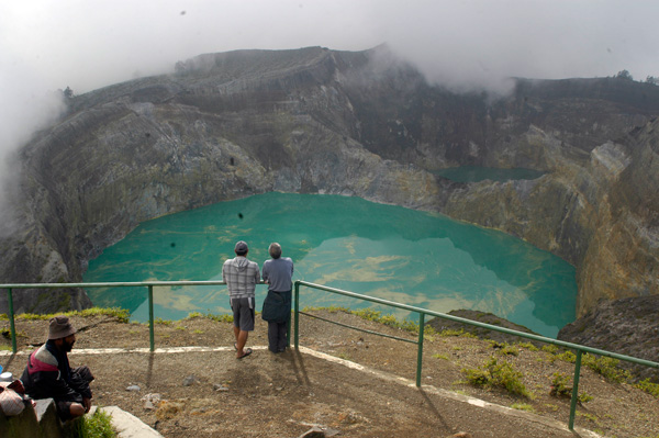 フローレス島 クリムトゥ火山の三色湖緑・黒・茶(今回は緑色だった・・変化するらしい) 黒い湖は珍しい。 |