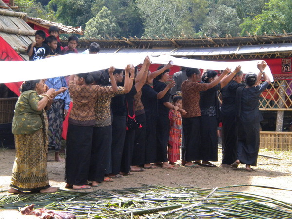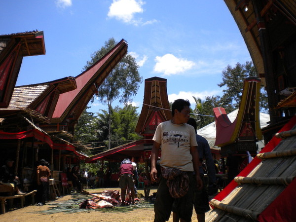 トラジャ 葬式風景・・中央で解体された牛が捧げられる。 |