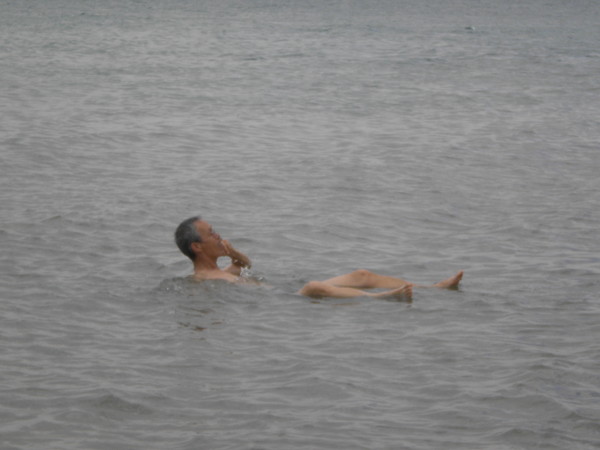 ヨルダン側死海にて ぷかぷか ただし動き回ろうとするとひっくり返ります。水が目に入ったらむごく痛い。ケツの穴とチンコの先も痛い・・・あまりのも塩分が濃いため。 |