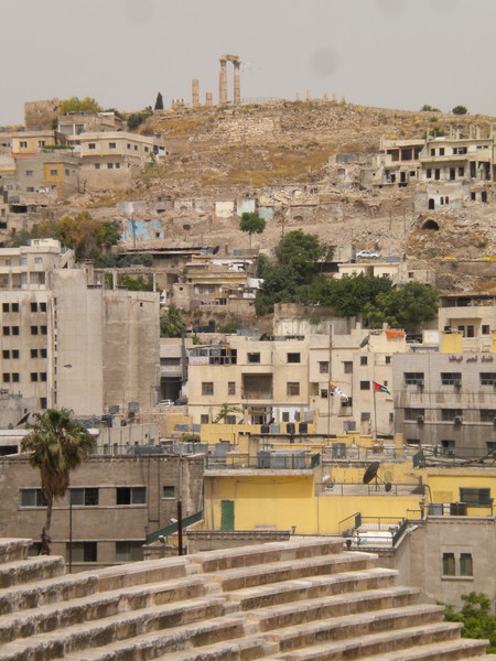 アンマンはこのように谷間の斜面と底部に町ができ上がっている。 丘の上にローマ神殿。 |