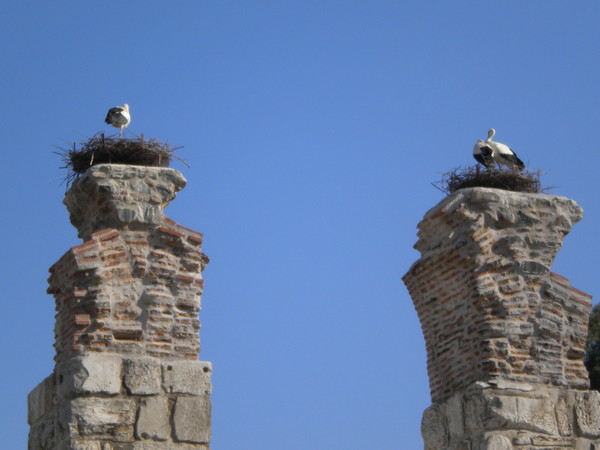 遺跡の柱のてっぺんに巣を作るコウノトリ |