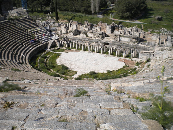 エフェス 円形劇場跡・・・一万人は収容できるという。 こういうところで本物のギリシャ悲劇を見てみたいなあ。 |
