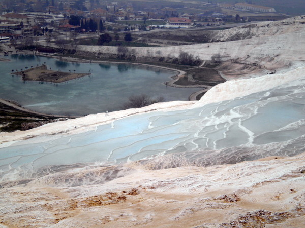 パムッカレ 訪れたときは冬で水枯れのため流れている温泉水は少なかった。 上部に張り巡らされたパイプとバルブによって調整管理されていた。 (ちょっと興ざめ) |