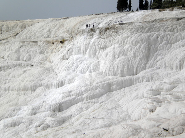 トルコ パムッカレ(世界遺産) カルシウムの多い温泉水が上から流れ出て、石灰岩の台地をこのような造形の美を形作った。 |
