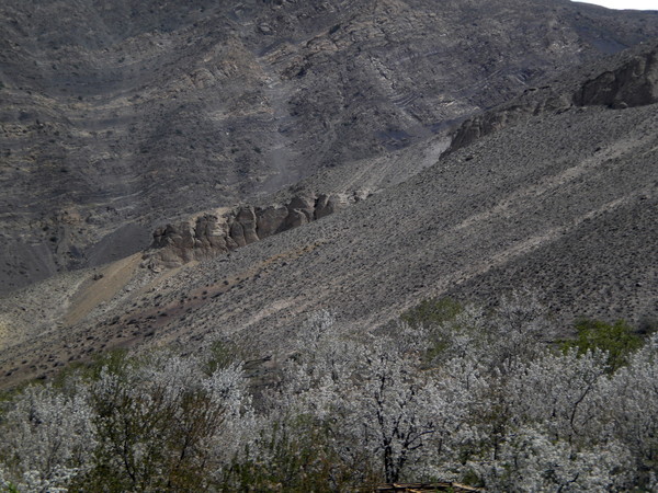 カッパドキア 線上に見えるのは地層の分かれ目。柔らかい部分の地層は崩壊して、堅い部分はキノコの頭のように残っていきます。 |