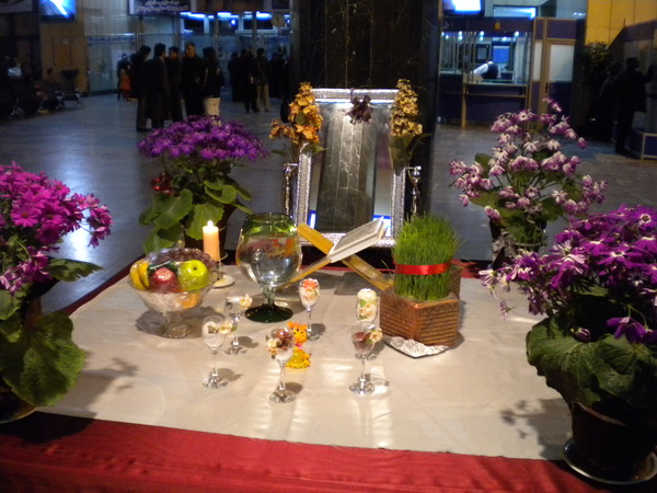 イラン テヘラン駅構内 ノールーズの飾り付け ちょうどイスラム新年のノールーズにあたり、イラン各地は民俗大移動や名所旧跡では観光地客であふれかえっていた。 このため電車は満員、宿は通常の何割増しか高かった。 |