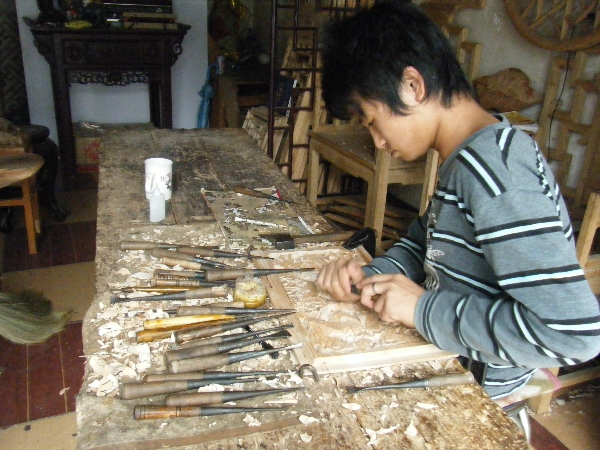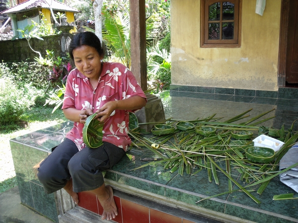 インドネシア・バリにて 神様へのお供え用の篭を編むおばちゃん。 (バナナの葉) |