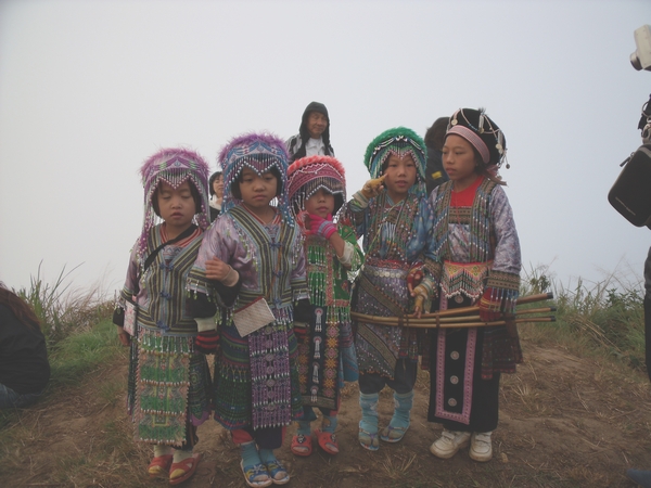 タイ・チェンライにて 朝早くから商売に駆り出されて眠そうなモン族の子供たち。 |