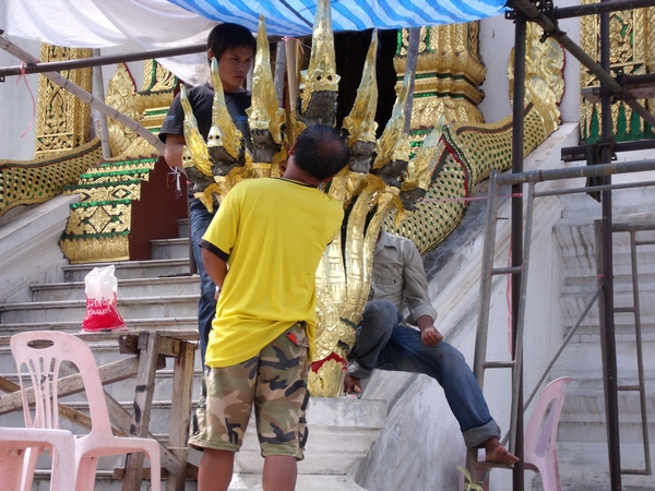 ラオス・ルアンパバンにて 旧王宮の修復の金箔張りをしている職人さん。真剣な目つきです。 |