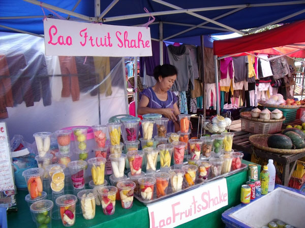 ラオス・ルアンパバンにて フルーツジュース屋さん。 好みのフルーツが入ったパックを指定して絞ってもらいます。 暑い日中はこれが一番! |