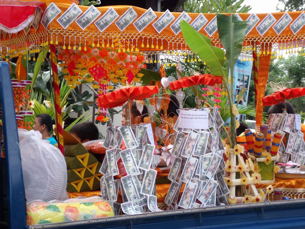 ラオス・ルアンパバンにて 結婚式の行列みたいなものを見かけました。ご祝儀をいっぱい付けて街を走ります。風で飛んじゃわないかな? |