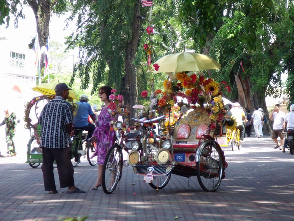マレーシア・マラッカにて ここの観光用リクシャーは派手派手しい飾りつけがされています。暗くなるとイルミネーションが点灯される。 |