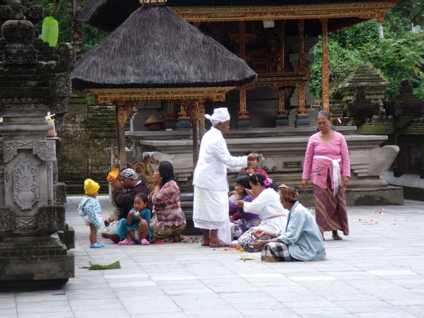 インドネシア・バリ島にて ヒンズー寺院にて聖水みたいなものを受けていた家族づれ。 |