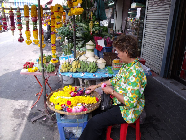 タイ・バンコクにて 寺院前でお供え用の花飾りを作って売るおばちゃん。 |