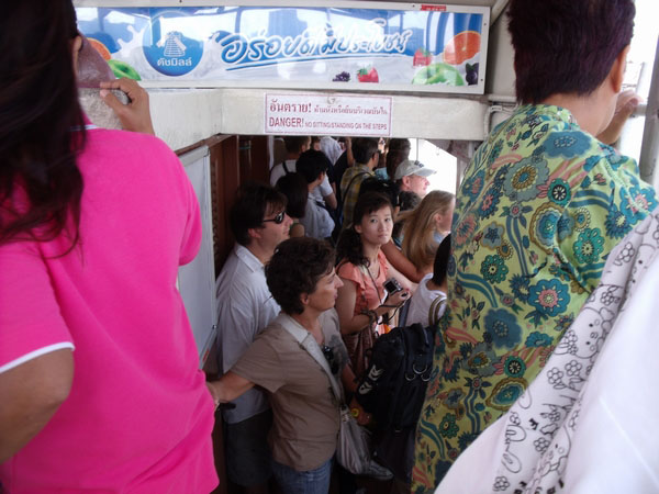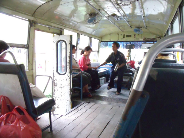 タイ・バンコクにて バンコク市内バスの車掌さん。左手に持つ円筒状のものをカチャカチャ鳴らして、お金を集めに来ます。混んでるときは大変、誰が乗ってきたか顔を覚えてなければならないですから。 |