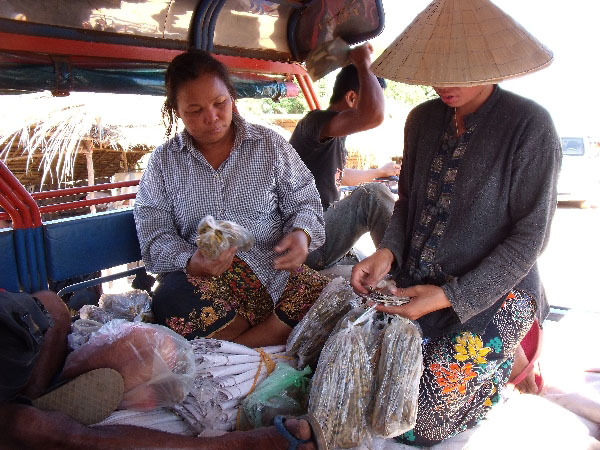 カンボジア・チャンパサックにて 乗り合いトラックへ乗り込んで食い物を売り込んでくるおばちゃん。手に持っているビニール袋のものは枝豆です。 |