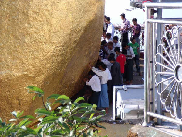 ミャンマー・チャッティーヨにて 聖なる岩に金箔を貼り付け祈る人々。なぜか女性禁制みたいです?? |