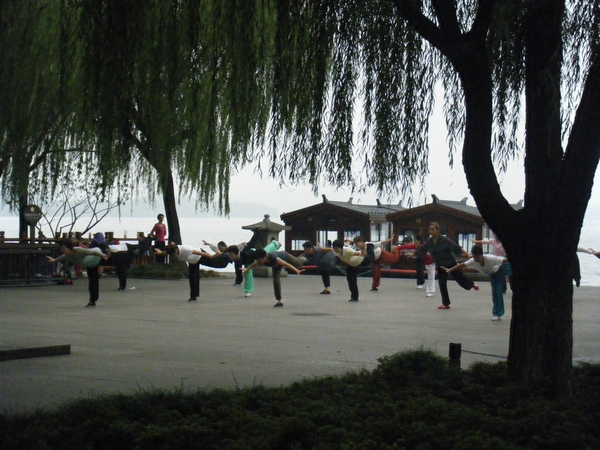 中国・杭州にて 朝早くから公園で、こちらは体の体操で太極拳。 |