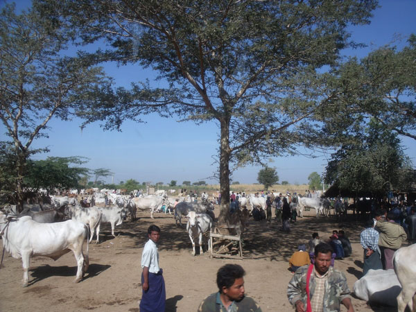 ミャンマー・中央部の村にて 牛の市でしょうか。何百頭の牛が集められていました。 |