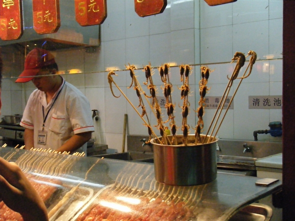 中国・北京にて 王府井小路で売っていたタツノオトシゴとさそりの串焼き。精力アップ抜群だそうな。 |