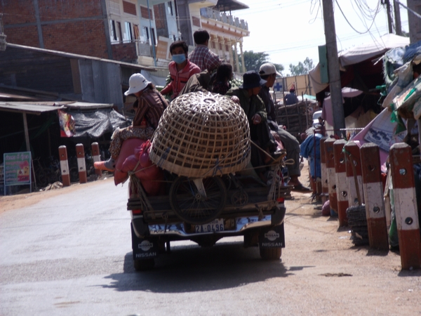 カンボジア・シェムリアップにて トラックは野菜や物だけではなく、人間も満載して走ります。 |