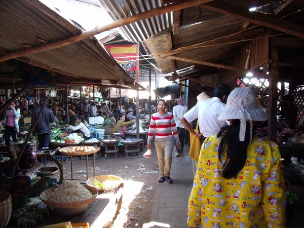 カンボジア・シェムリアップにて 市場内。カンボジアでは右側の女性が来ているようなパジャマが普通服として女性が着て、街中を闊歩しています。赤や青や黄、緑等派手な色と柄のものを。 |