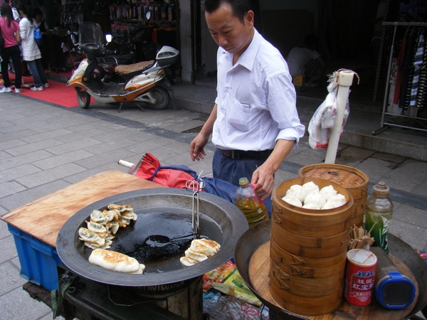 中国・蘇州にて 下町繁華街の道路の真ん中で餃子と小龍包を売っていた。これが安くて上手い!! |