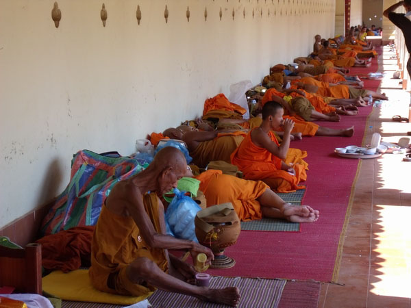 ラオス・ビエンチャンにて かなり大きな仏教寺院の祭礼かなんかで集まっている坊さん。ほとんどが暑くて寝転んでいた。 |