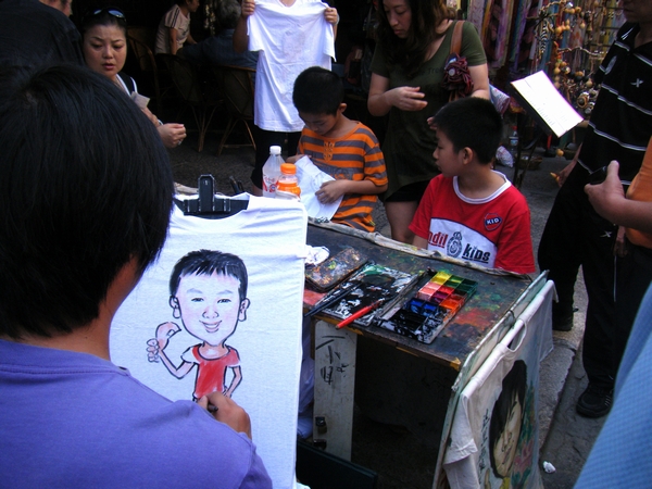 中国・桂林(陽朔)にて Tシャツに似顔絵を描いてます。シャツ代抜きで5元だったかな? |